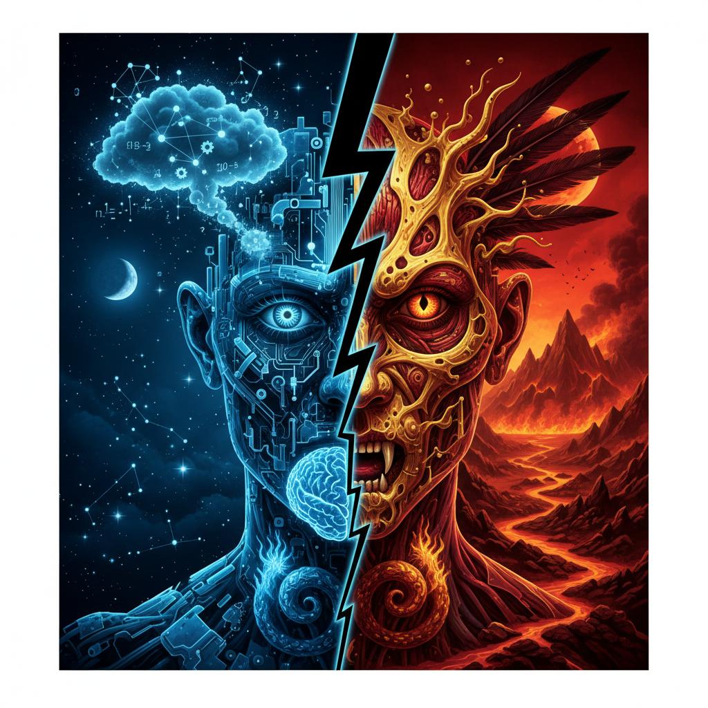 Image: Split portrait of a thinker: half analytical, half instinctive, surreal style, high contrast. Alt: Visual metaphor for intuition and logic in decision-making.