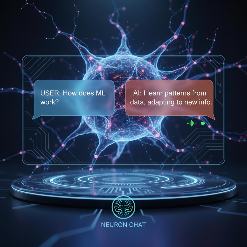 A neural network pulses beneath the chat interface, visualizing the unseen complexity that powers every machine learning chatbot conversation.