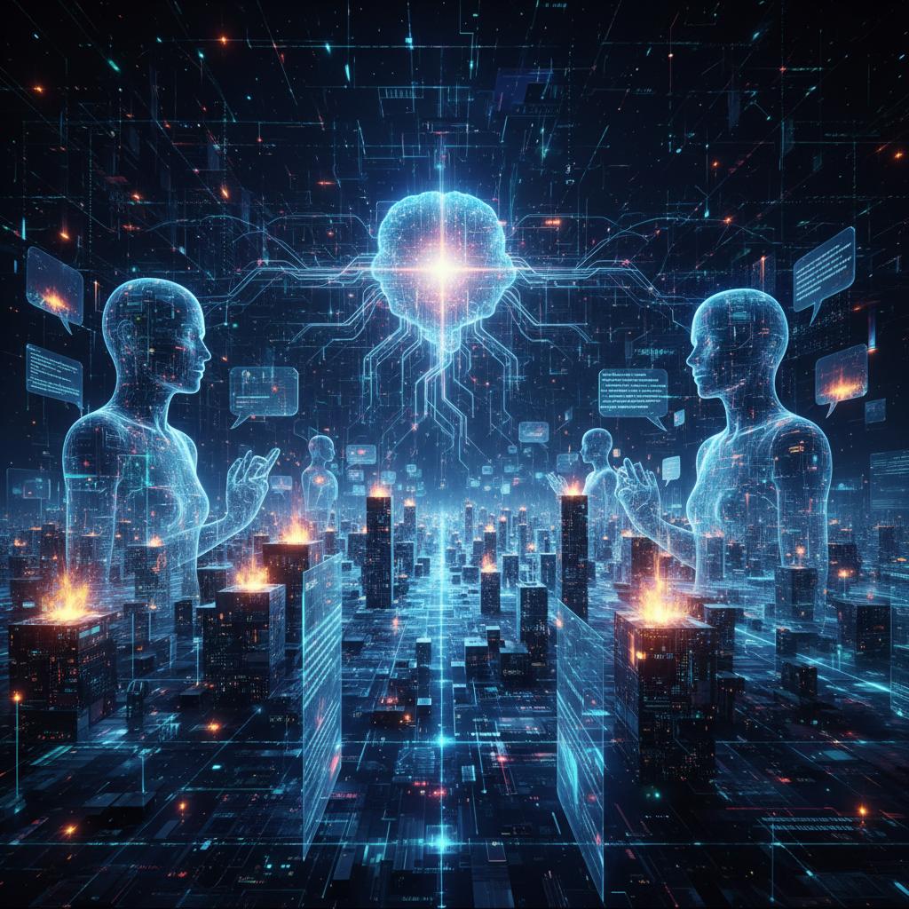 Alt: Interconnected chatbot avatars exchanging speech bubbles and code in a digital cityscape, representing AI assistant ecosystems.