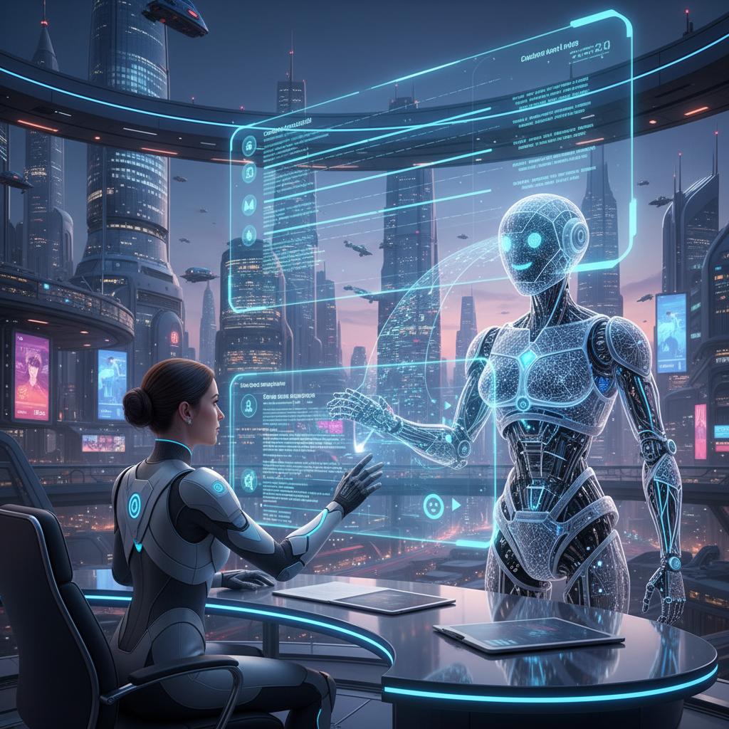 Alt text: Futuristic customer support team blending human agents and AI chatbots for optimal cost efficiency in 2025.