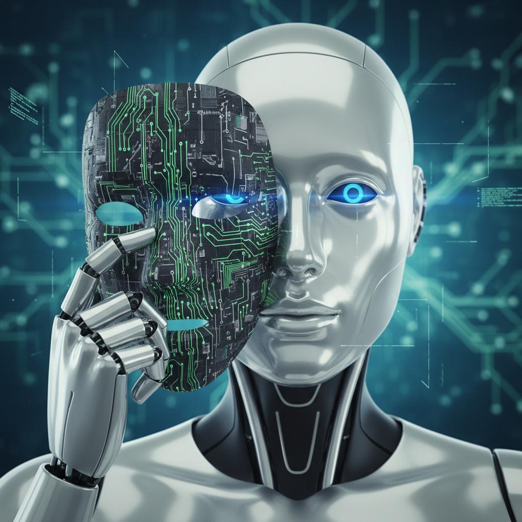 Chatbot removing a mask to reveal authentic AI intelligence beneath, symbolizing the difference between real and superficial specialization