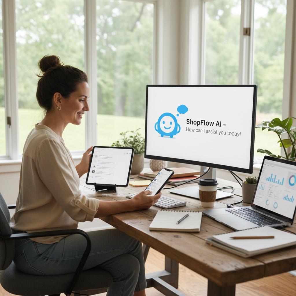 Alt text: Small business owner interacts with advanced AI chatbot tools across multiple devices